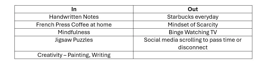 2. What’s In and What’s Out List in 2025: This isa list of what you design with your goals of what is in and what is out. Here is an example:
